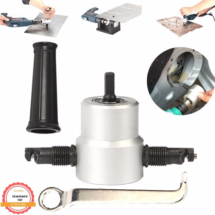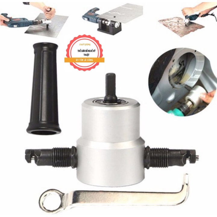 chuyển đổi máy khoan thành máy cắt tôn ( có 2 màu bạc và cam )Đầu cắt tôn có 2 đầu cắt, cắt được các hình dạng và đường cong bất kỳ, khác phục hoàn toàn nhược điểm của máy cắt cầm tay, đó là: chỉ cắt được đường thẳng; hay bị lẹm vào các góc cạnh; phải thay lưỡi cắt thường xuyên