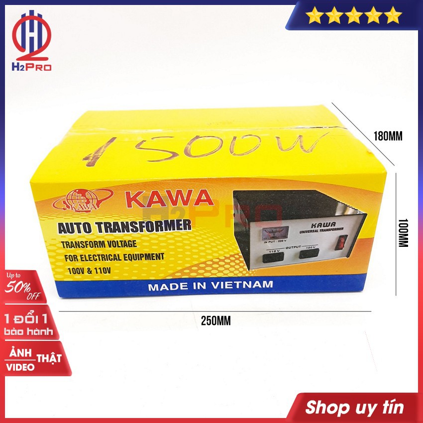 Biến áp tự ngẫu Kawa có 2 loại với chức năng chuyển điện 220v sang 110V-100V và đổi điện từ 110V sang 220V. Bộ đổi nguồn đang được Thế giới công nghệ H2Pro phân phối và bán lẻ, giao hàng toàn quốc là hàng chính hãng, được sản xuất tại Việt Nam. H2Pro có đủ công suất đổi nguồn cho khách hàng lựa chọn như 250W, 500W, 750W, 1200W, 1500W, 2000W, 3000W.- Lưu ý: Chọn công suất đổi nguồn phù hợp với thiết bị