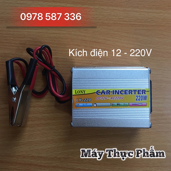 - Máy Thực Phẩm xin giới thiệu sản phẩm Bộ kích điện 12V - 220V – 220W chức năng dùng đổi nguồn từ bình ắc quy 12V sang 220V sử dụng cho các thiết bị điện trong gia đình.