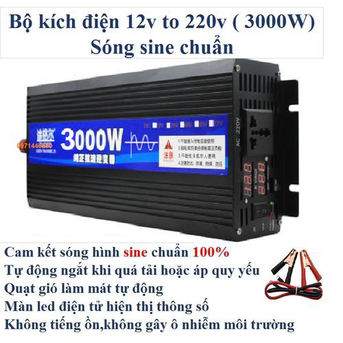 Bộ đổi nguồn 3000w sine chuẩn Điện áp vào:12v Điện áp ra:220v Công suất đỉnh: 3000w Công suất liên tục: 1500w