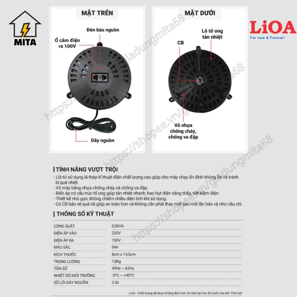 Bộ đổi nguồn LiOA 200VA (~160W) chuyển điện từ 220V sang 100V DN002- MITA