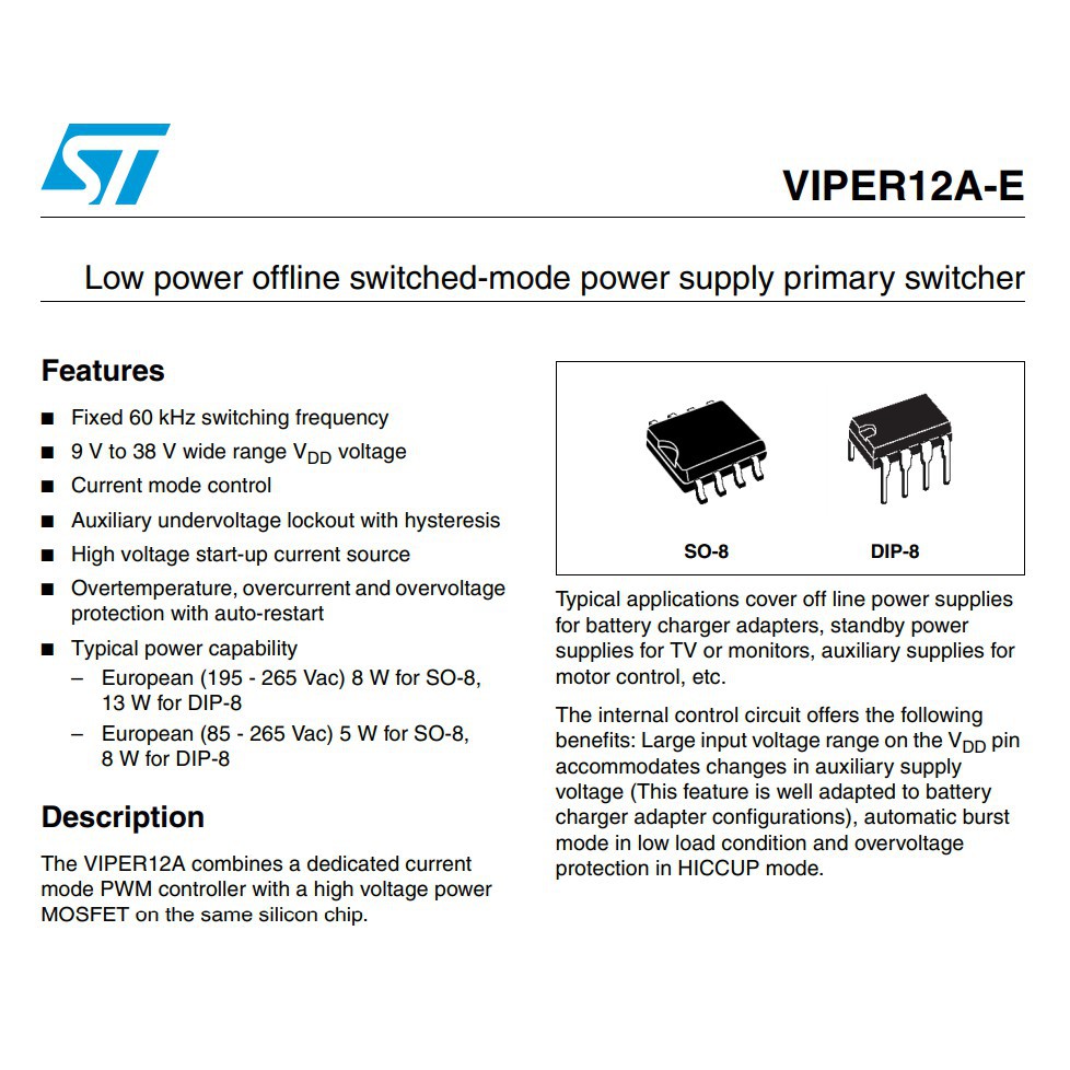 IC nguồn Viper12A có hai dạng đóng gói 8 chân là VIPER12A SOP-8 và Viper12A DIP-8. Công suất từ dao động 8W - 13W tùy dải điện áp.