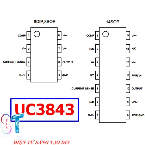 - IC UC3843B Dip-8 là dòng IC tạo dao động thay thế trong các bộ nguồn xung, adapter, nguồn tổ ong, hồi tiếp, công suất, nguồn boost, nguồn nhân áp,...