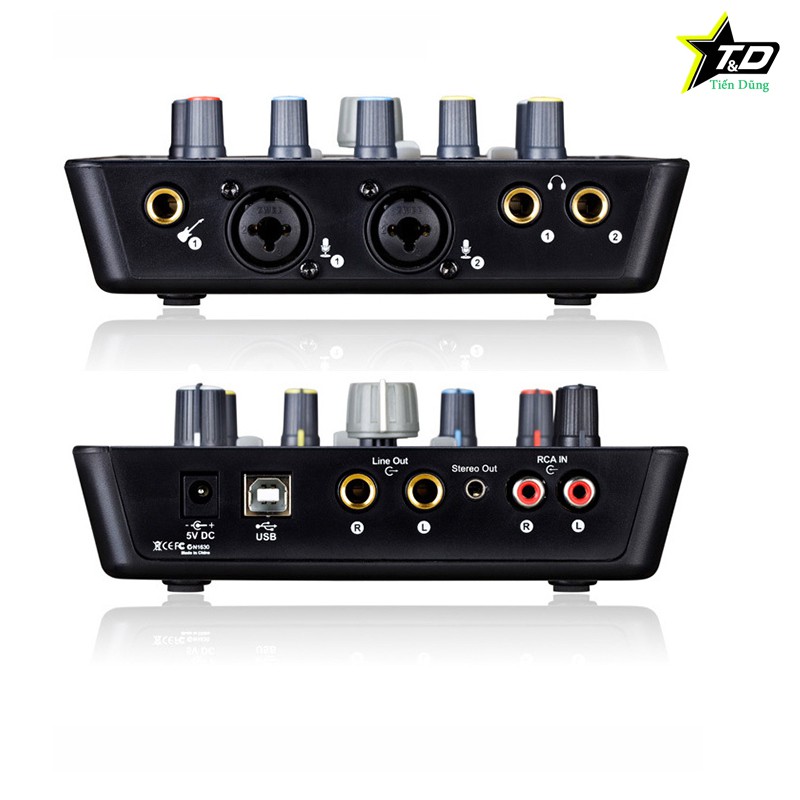 - Hai cổng mic in combo 2 cổng giao tiếp XLR (48V)và 6.3mm (5V) với 2 núm điều chỉnh Gain riêng biệt.