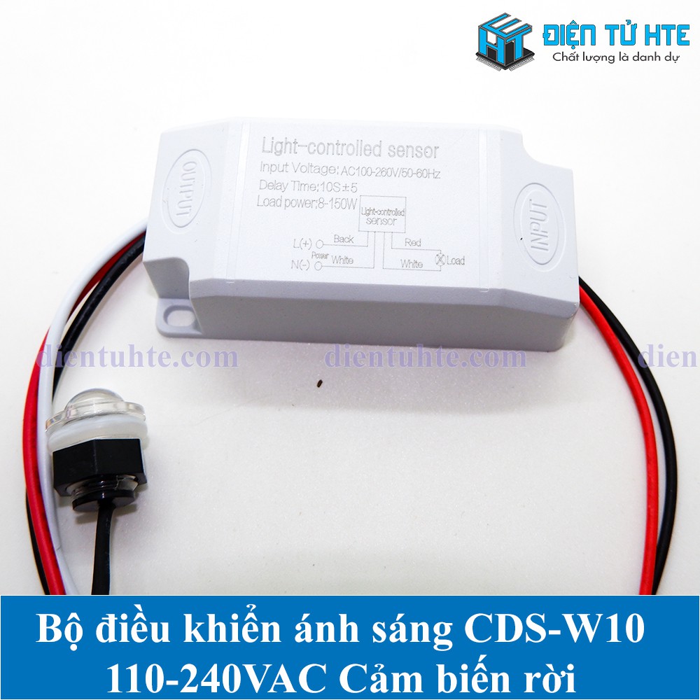 Bộ điều khiển cảm biến ánh sáng CDS-W10 110-240VAC Cảm biến rờiBộ điều khiển hoạt động dựa trên cảm biến cường độ ánh sáng, thiết bị sử dụng trực tiếp điện thế 110V đến 220VAC, ứng dụng điều khiển bật tắt đèn chiếu sáng theo ánh sáng. Sản phẩm có thể dùng điều khiển đèn chiếu sáng dân dụng, đèn đường, đèn chiếu sáng công cộng vào ban đêm.