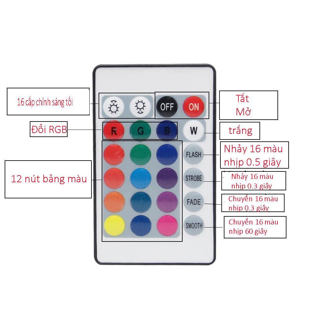 Bộ điều khiển từ xa có 16 nút màu khác nhau và 4 loại ánh sáng khác nhau: Chớp tắt / Nhấp nháy / Chuyển màu dần / Đều màu. Thích hợp cho dải đèn LED SMD.