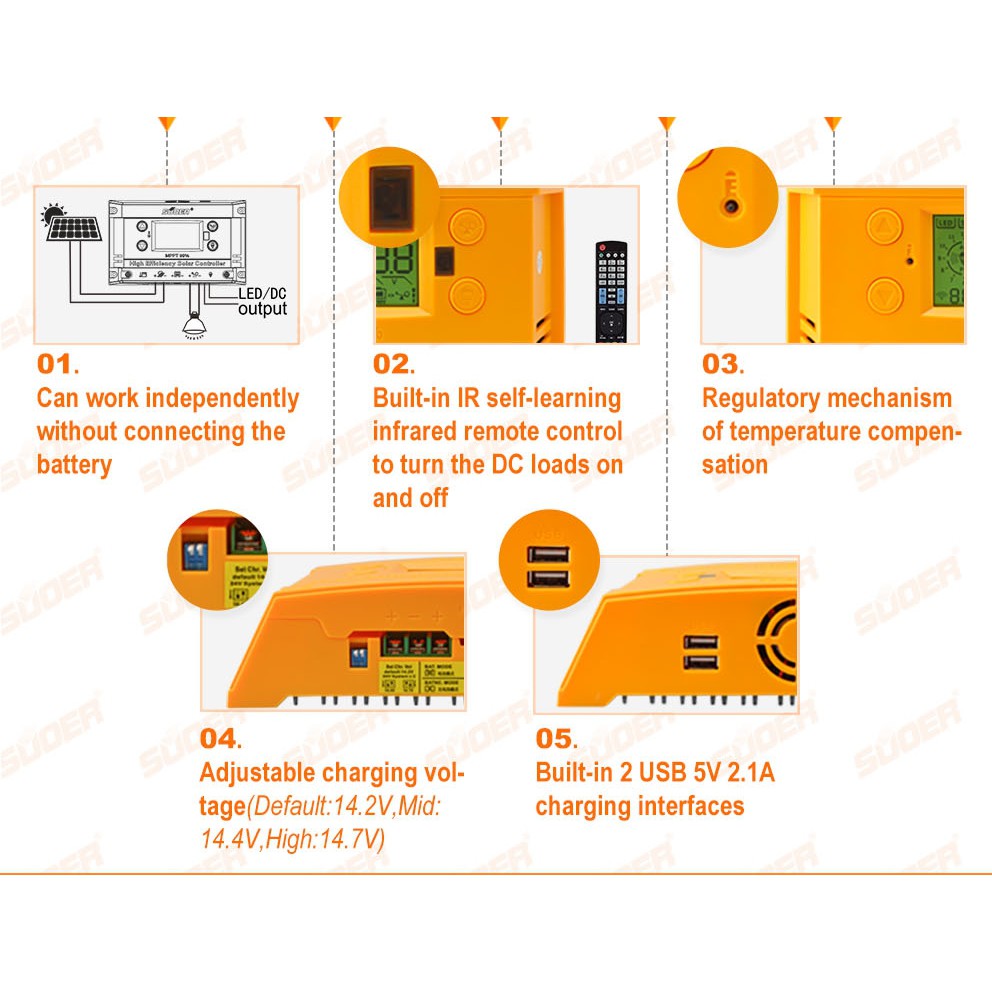 Điện áp sạc điện áp không đổi Mặc định: Các thông số 14.2V (24V pin * 2) có thể được cài đặt trong menu / Chuyển đổi nhanh có sẵn
