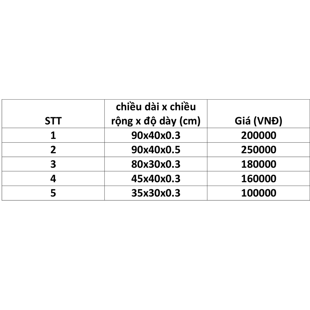 - Kích thước: 800x300x3mm - 900x400x3mm - 900x400x5mm