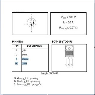Dòng điện cực đại mosfet IRF460: ID = 20A