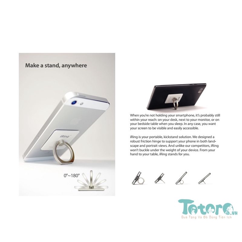 - Với thiết kế móc xoay đặc biệt có thể gập 180 độ hoặc xoay 360 độ, iRing có thể gấp gọn và không gây vướng víu khi sử dụng hoặc duỗi ra khi cần điểm tựa để đứng vững trên mặt phẳng.