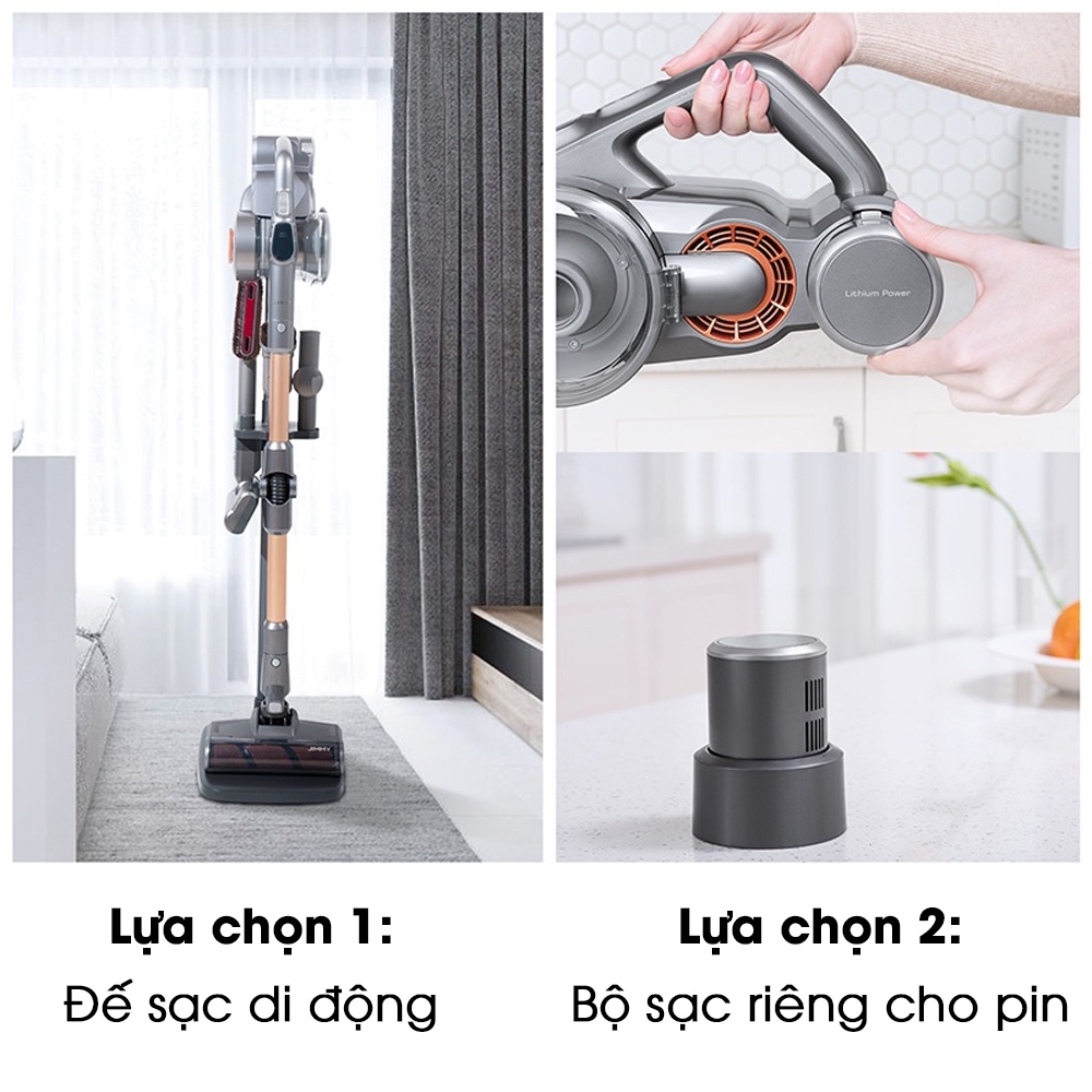 - Thời lượng dài 80 phút: công suất lớn 3000mAh, được trang bị động cơ JIMMY 55% nâng cao hiệu suất. Pin có thể tháo rời với hai tùy chọn sạc khác nhau.