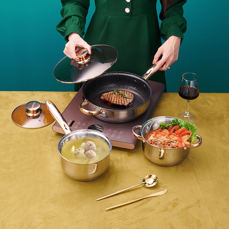 Nhà cửa & Đời sống > Dụng cụ nhà bếp > Chảo || Kaisa Villa bộ nồi inox Đức Bộ nồi 6 món chảo chiên cao cấp inox Nồi súp Chảo sữa ấm đun nước dùng bộ nồi bếp từ KV1004Còn hàng