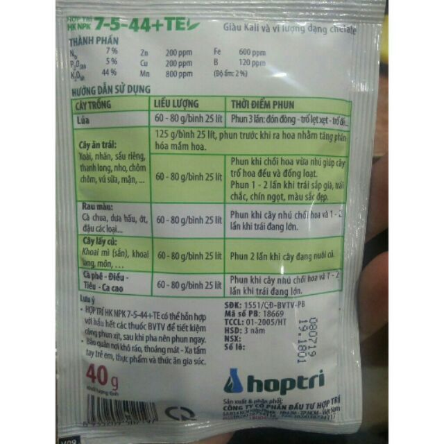 Nhà cửa & Đời sống > Làm vườn > Phân bón || [Kali siêu ngọt] Phân bón lá/rễ NPK 7-5-44+TE Hợp Trí- Ra hoa sớm, hoa trổ đều, đồng loạt, ngừa thối tráiCòn hàng