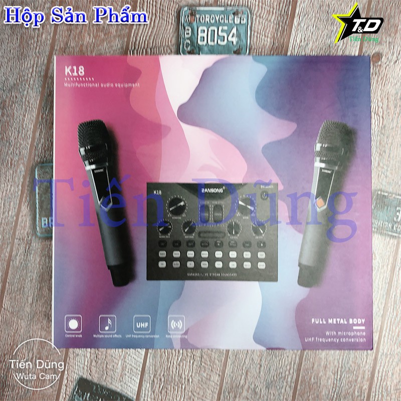 - Sound Card Zansong K18 (Kèm 2 micro không dây) Hỗ trợ kết nối với 2 micro không dây đi sẵn thông qua sóng UHF để giúp cho khả năng kết nối truyền tải ổn định nhanh nhất và Micro không dây sẽ dùng Pin AA dễ dàng thay thế khi hết Pin
