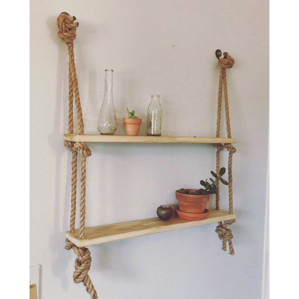 Nhà cửa & Đời sống > Dụng cụ chăm sóc nhà cửa > Dây phơi & giá phơi quần áo || Kệ 2 Tầng Dây Thừng Gai Treo Tường Trang Trí ĐỘC ĐÁOGỗ Thông Tự Nhiên Bản Dài Hẹp - Kích Thước DxR: 60x11cmCòn hàng