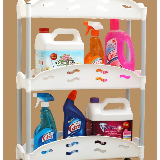 Kệ đa chức năng 3 tầng có bánh xe kéo tiện dụng, di chuyển dễ dàng khi cần lấy đồ đạc. Bạn có thể để kệ trong phòng ngủ hay phòng khách hoặc trong nhà bếp, phòng tắm... đựng các vật dụng linh tinh