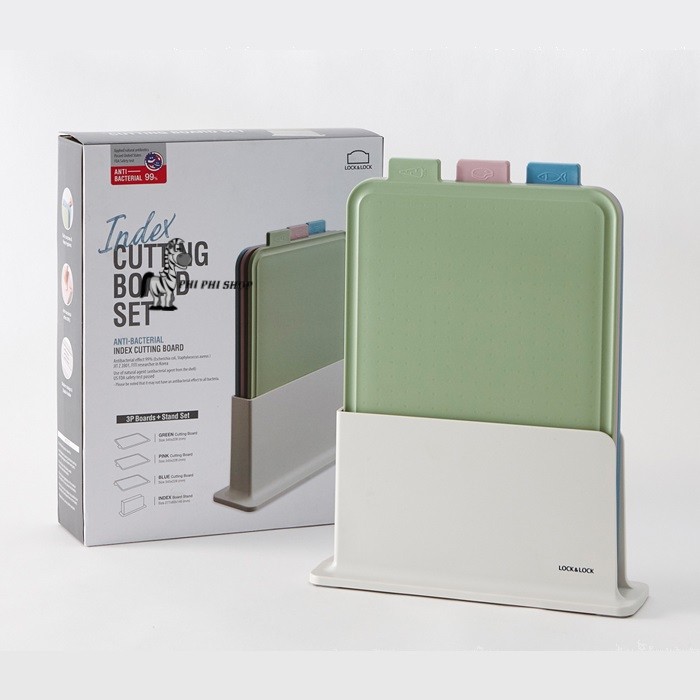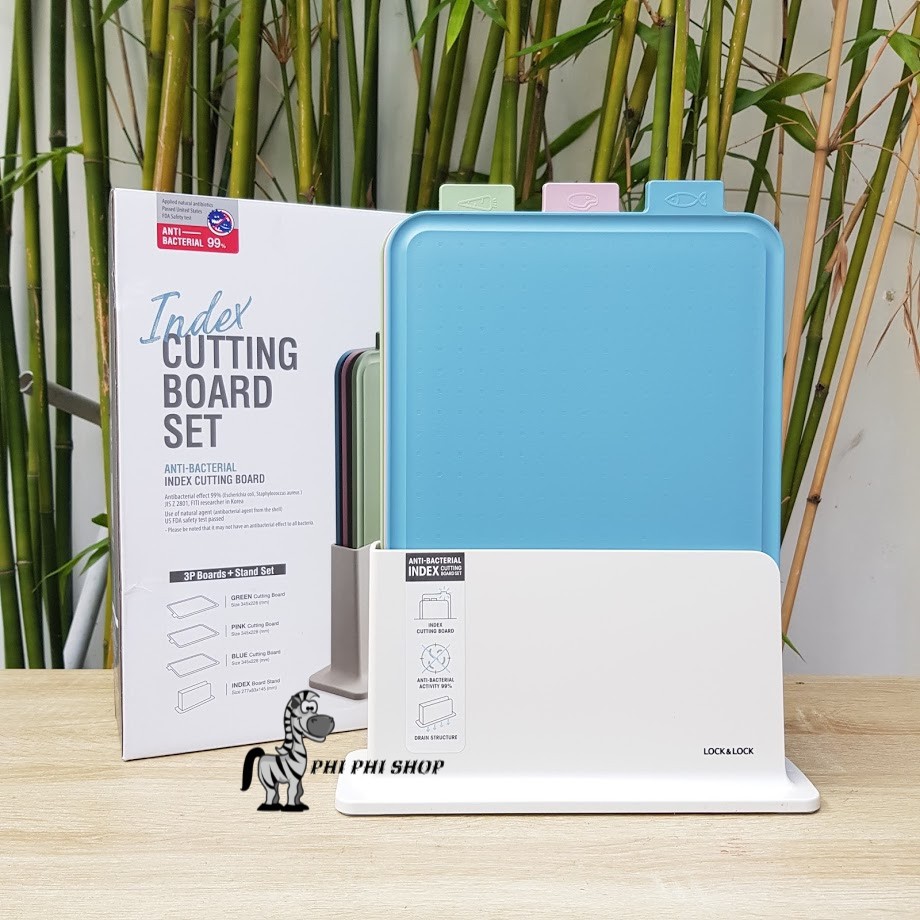 Bộ kệ 3 thớt nhựa kháng khuẩn LOCK&LOCK Index Cutting Board3 thớt sử dụng vệ sinh cho 3 chức năng khác nhau : chế biến cá , chế biến thịt và chế biến rau củ quả .
