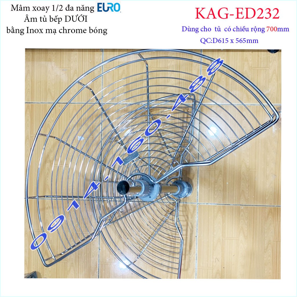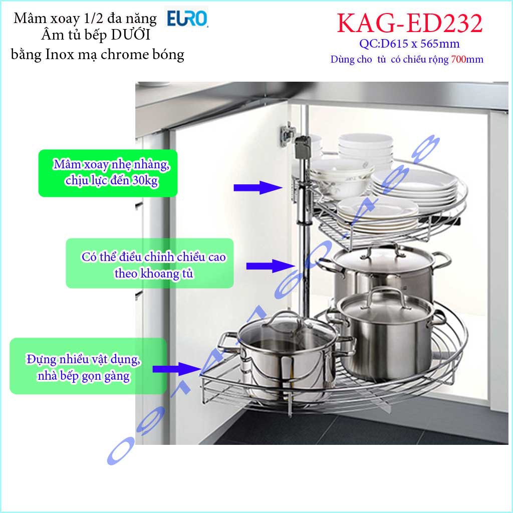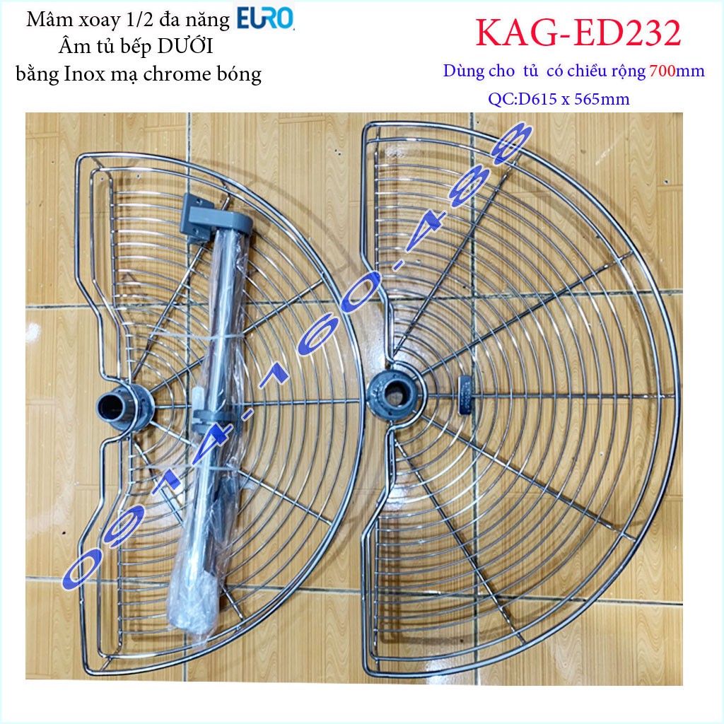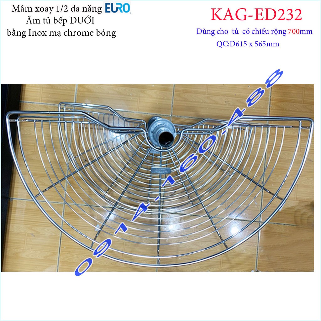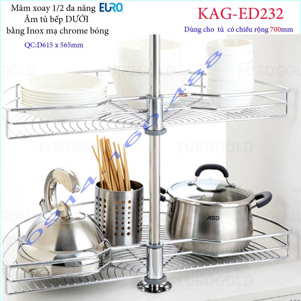 Kệ bán nguyệt Euro KAG-ED232- 2 tầng, mâm xoay inox 1.2, kệ góc tủ bếp dưới inox tròn thiết kế đẹp tiết kiệm không gian bếpKích thước sản phẩm: đường kính 615mm x cao 130mm x 2 tầng