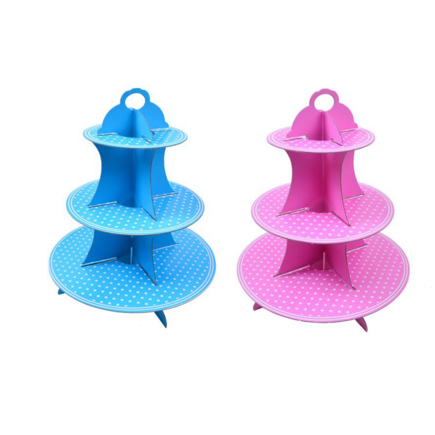 Kệ bánh cupcake 3 tầng màu chấm bi xanh hoặc chấm bi hồng trang trí sinh nhật thôi nôi