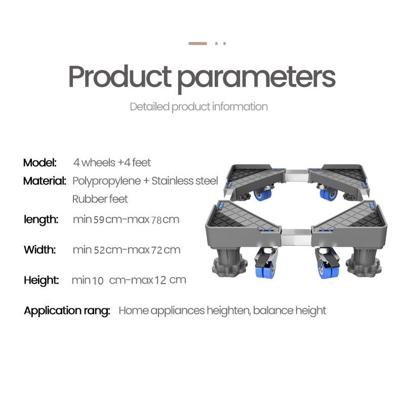 Chân đế có thể thay đổi được cả chiều dài và chiều rộng từ 51-77cm tùy theo kích thước máy giặt, tủ lạnh.