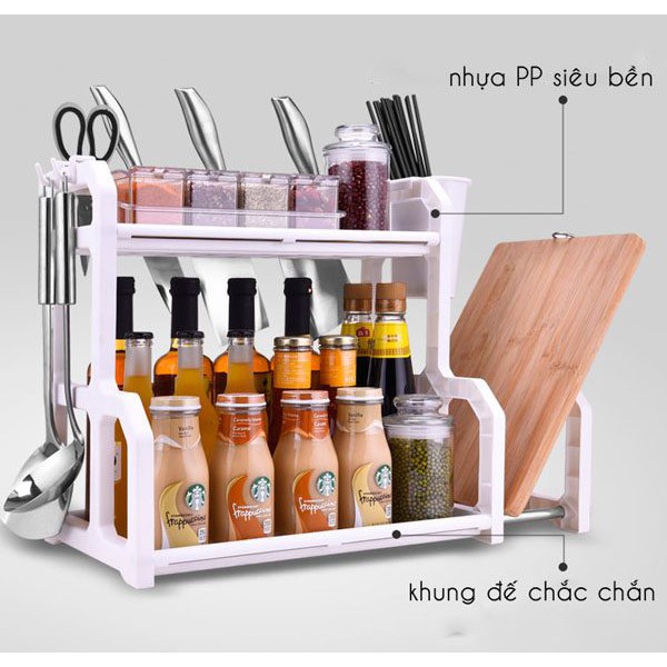 - Giá thiết kế gồm 2 tầng, có ống cắm thìa, đũa, cắm dao, móc treo, khay trượt để thớt thông minh