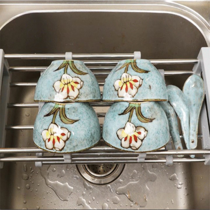 KỆ CO GIÃN ĐẶT NGANG BỒN RỬA BÁTSản phẩm kệ co giãn đa năng có thể kéo dãn ra và co vào để tùy chỉnh kích thước - thay đổi độ dài của khay cho phù hợp