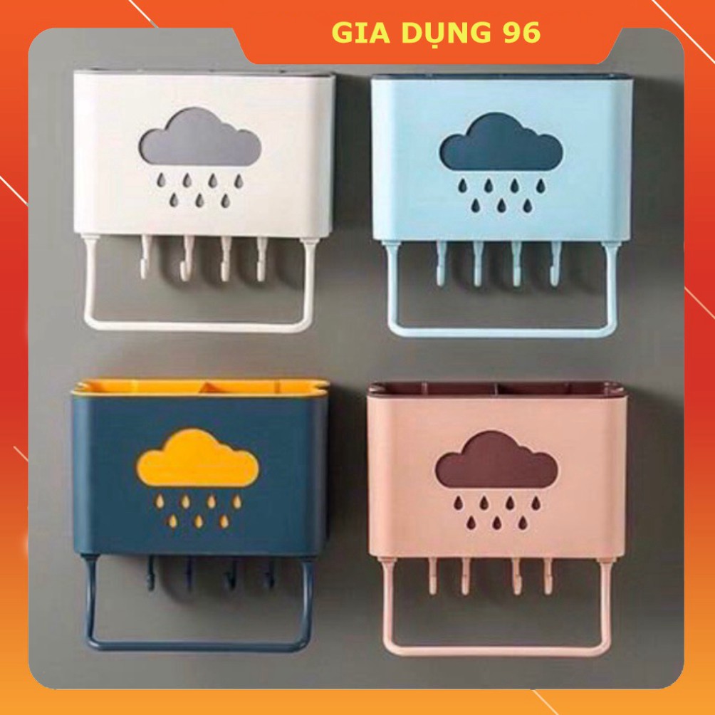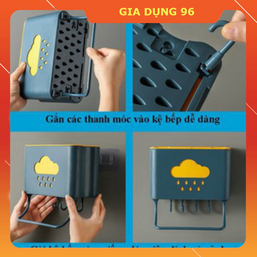 - Kệ đám mây treo tường còn có chỗ để treo khăn. Ngoài kệ còn có các móc nhỏ để treo các vật dụng khác như phới đánh trứng, nạo gọt củ quả...