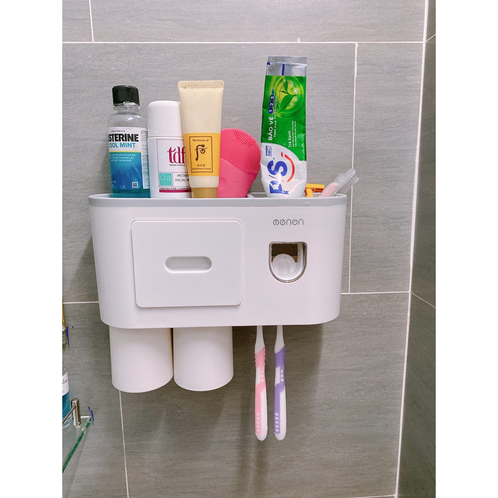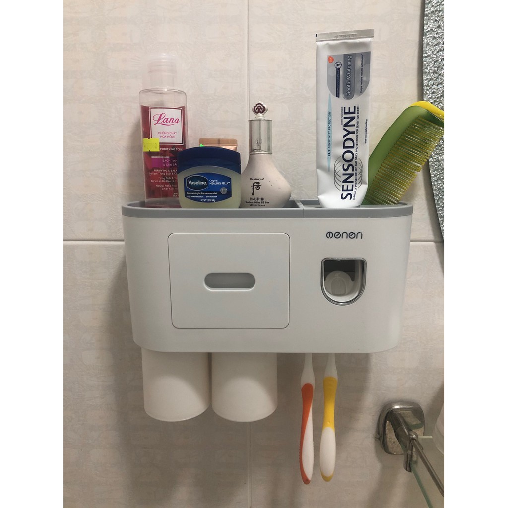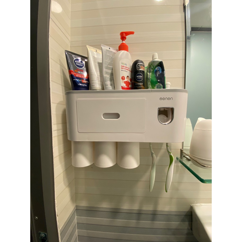- Sản phẩm gồm: 1 Kệ nhà tắm tích hợp chức năng lấy kem tự động + Cốc hút từ tính + miếng dán tường