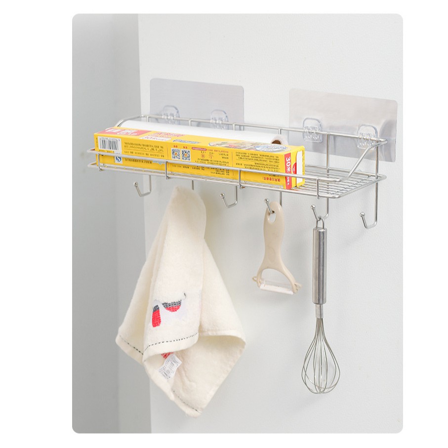 Kệ dán tường 6 móc Inox 304 nhà bếp, nhà tắm siêu chắc chắn