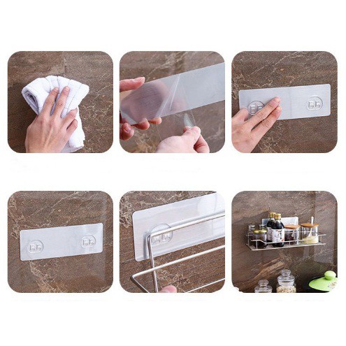 - Sp đi kèm với 02 miếng dán dài bạn chỉ cần dán lên gạch/kính rồi treo kệ lên là có thể dùng không cần khoan đục.
