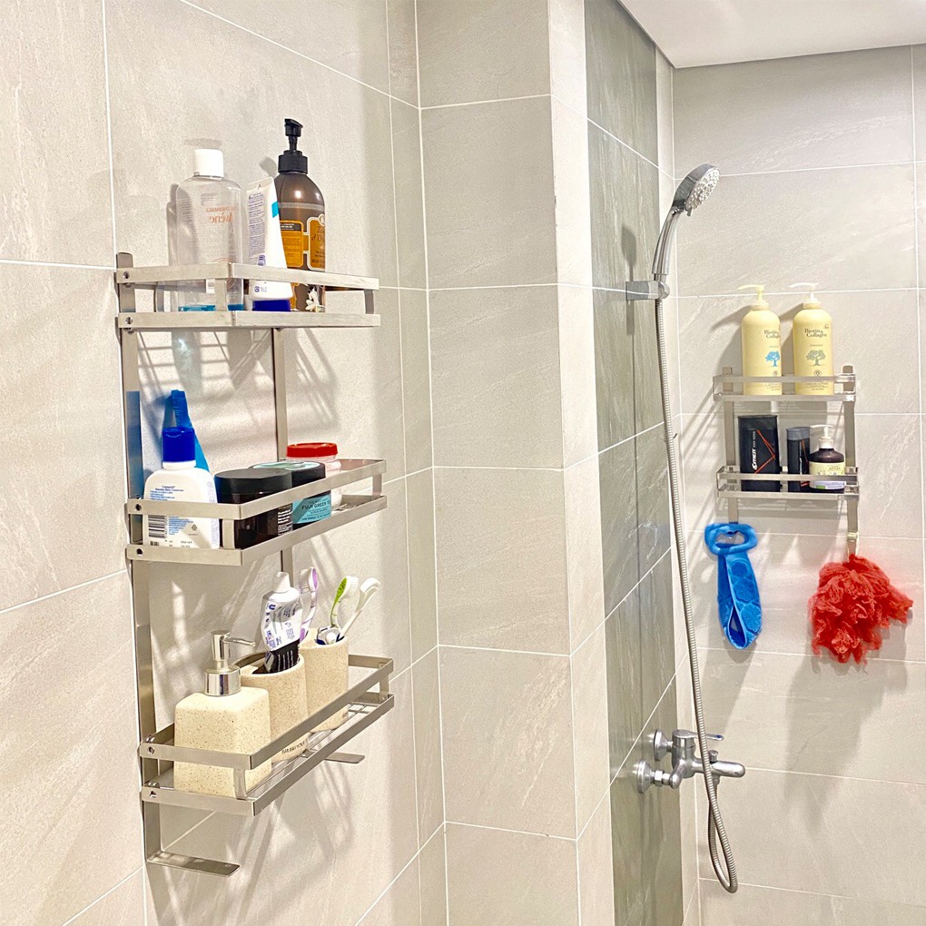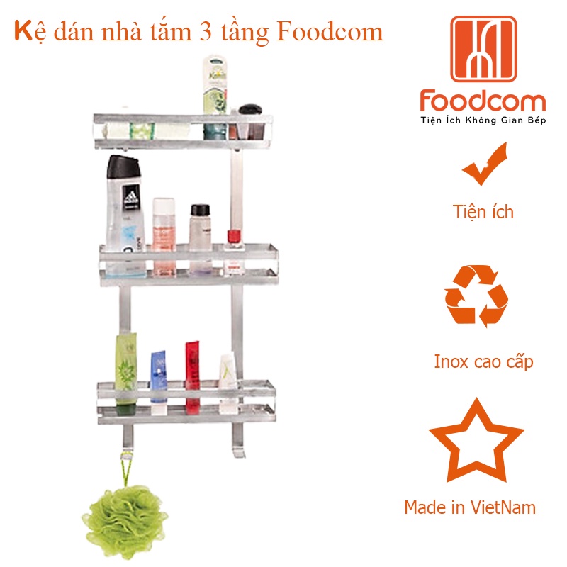 Kệ dán tường nhà tắm đa năng 3 tầng Foodcom chất liệu inox cao cấp không han gỉ có keo 3M chắc chắn không khoan đục giúp nhà tắm gia đình bạn sang trọng gọn gàng và sạch sẽTHÔNG TIN SẢN PHẨM: