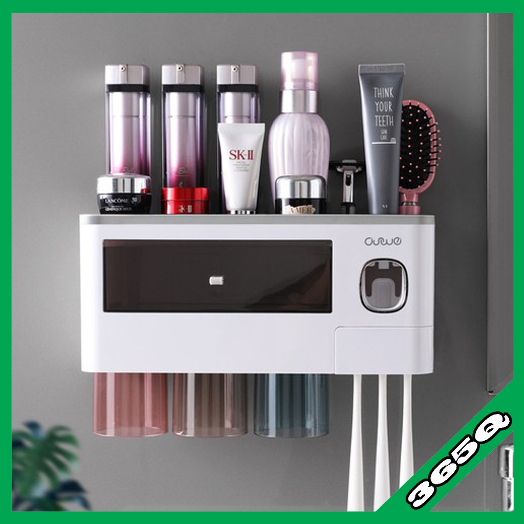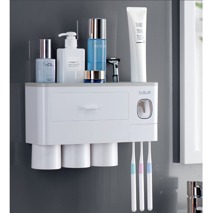 Kệ dán tường nhà tắm thông minh bộ 3 cốc đế từ hút, nhả kem đánh răng tự động tiện lợi, nhựa không gây hại sức khỏe