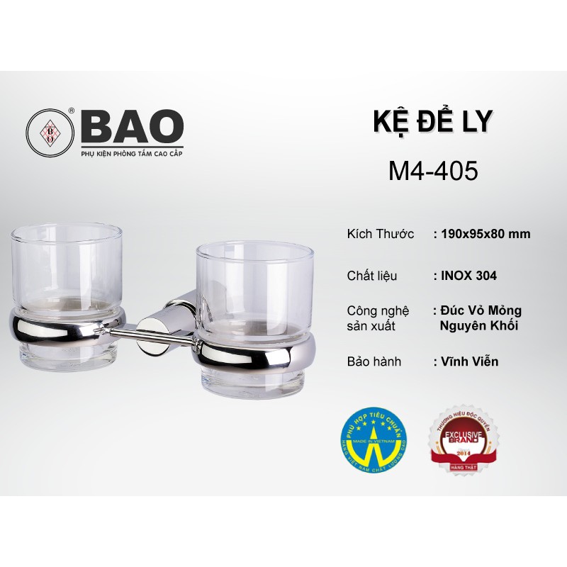 Với công nghệ Tempered Glass mang đến độ cứng chống trầy, khi vỡ tạo thành những khối vuông nhỏ an toàn. Sản phẩm được sản xuất bằng công nghệ đúc vỏ mỏng, mẫu mã sắc sảo, hình dáng thanh mãnh, nhưng không kém phần sang trọng.Kệ ly BAO inox M4-405 đẳng cấp và sang trọng gồm 01 kệ để ly có 02 ly đính kèm. Kệ để ly có khung được làm bằng chất liệu inox 304 chắc chắn, chịu lực cao, chịu được sự mài mòn, chống trầy xước, dễ vệ sinh, dễ chùi rửa. Bộ đôi kệ và ly được thiết kế nhỏ gọn và tiện lợi, dùng để sử dụng cho việc đánh răng, vệ sinh cá nhân,... mang lại một không gian sạch sẽ, khô ráo và đẳng cấp. Với thiết kế sang trọng và linh hoạt, sản phẩm phù hợp với không gian phòng tắm, được dùng trong gia đình, nhà hàng, khách sạn,...Ngoài kệ ly M4-405, chúng tôi còn cung cấp rất nhiều mẫu kệ ly khác, quý khách có thể nhắn tin, bình luận để được tư vấn mẫu mã phù hợp với sở thích và nhu cầu sử dụng.