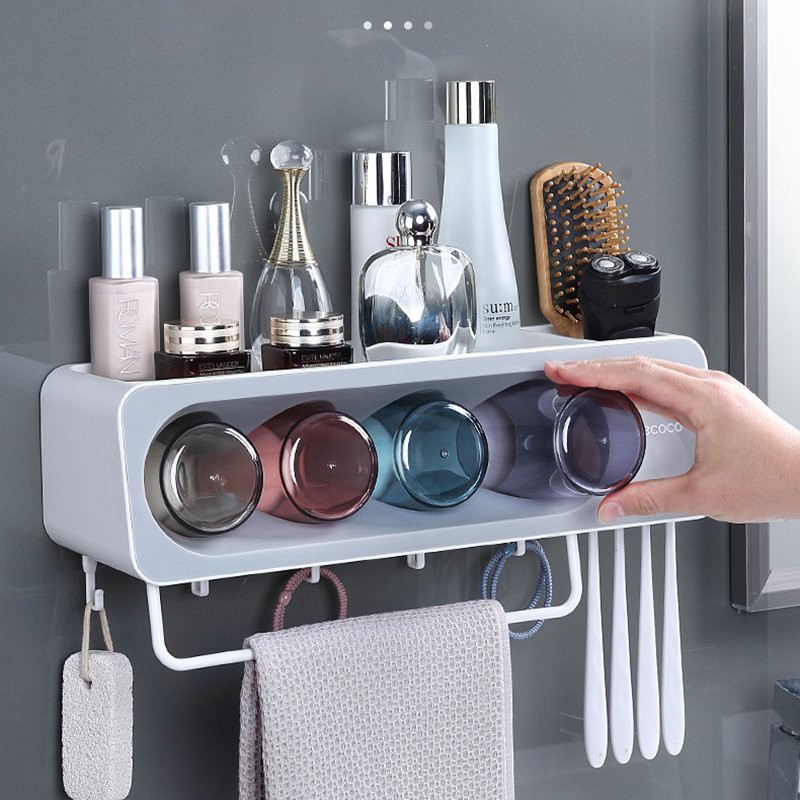 - Sản phẩm gồm chỗ đựng kem đánh răng, bàn chải đánh răng, chỗ để đồ mỹ phẩm, xà phòng, có giá treo khăn.