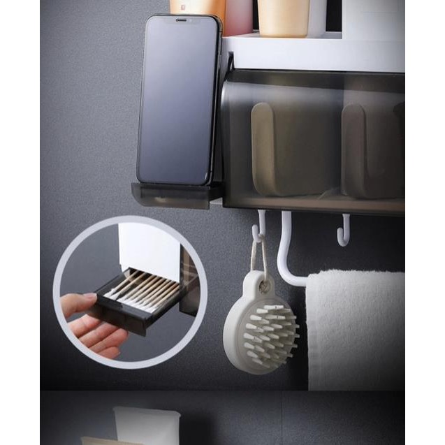 Phía bên trái kệ tích hợp giá đỡ để điện thoại bên trong để các vật nhỏ như bông tăm tai. Và bên phải là phần quan trọng để kem đánh răng với đặc điểm lấy kem tự động và khe lớn để lược rất tiện dụng