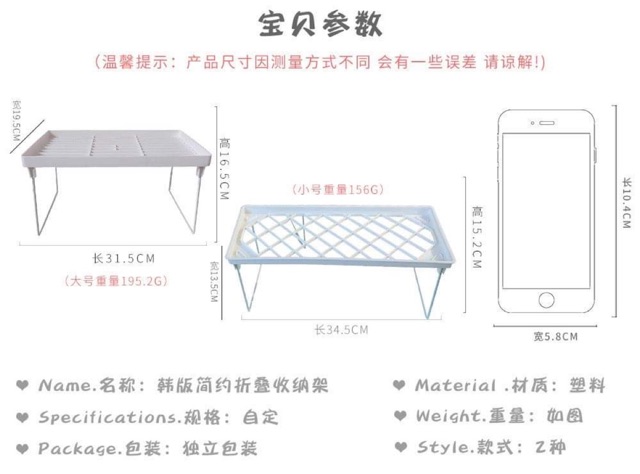 - kệ to kích thước : ngang 31.5cm , rộng 19.5cm , cao 16,5cm- kệ nhỏ : ngang 34,5cm , rộng 15,2cm , cao 13.5cm