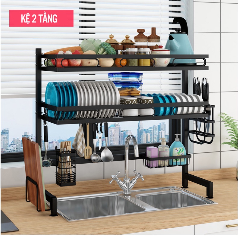 ✔️ Bộ sản phẩm đày đủ: Kệ để chén đĩa inox, giá để dao đũa thìa, giá để thớt, giá để nước rửa bát khăn lau bát, 6 móc treo nồi.