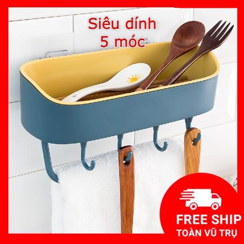 Kệ để đồ nhà tắm dán tường siêu dính có 4 móc thanh treo khăn tiện dụng dễ dàng tháo lắp màu xanh vàng trắng