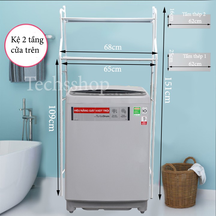 Khung với thiết kế 2 tầng/3 tầng phù hợp với loại máy giặt cửa trên/cửa trước hoặc sử dụng 2 tầng cho loại cửa trên. Với ống sắt đường kính từ 16 mm và được sơn tĩnh điện giúp cho kệ chắc chắn chịu lực và bền theo thời gian