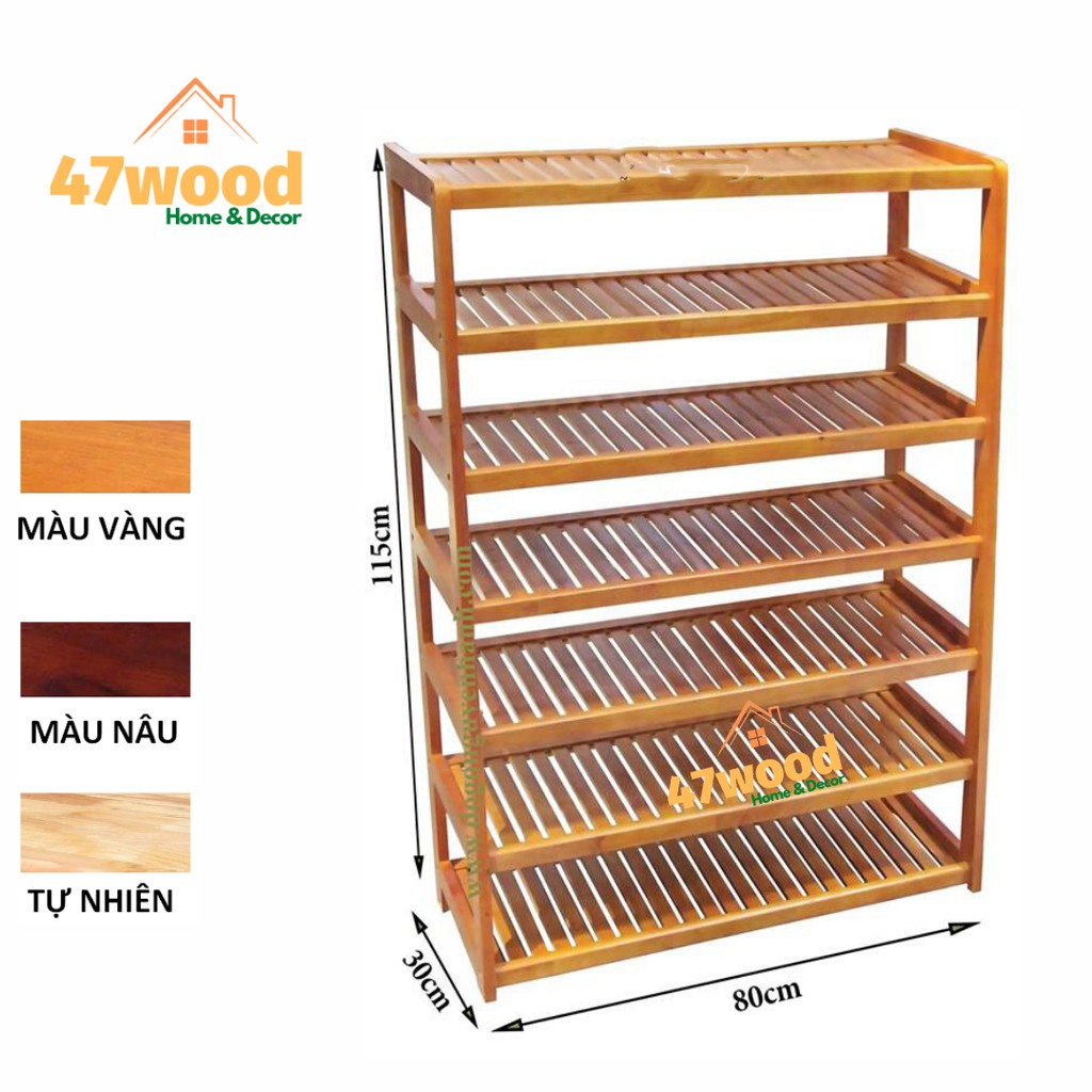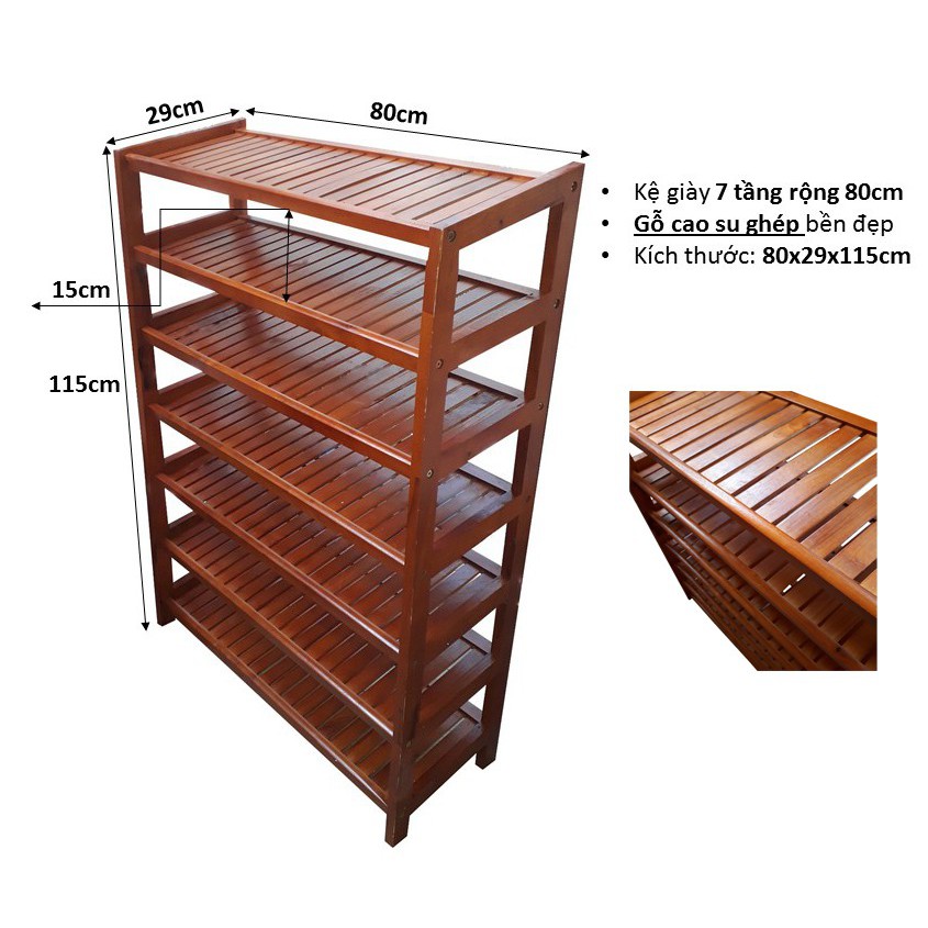Kệ để giày dép bằng gỗ 7 tầng rộng 80cm, gỗ cao su chống nướcKệ cao 115cm, rộng 80cm, sâu 28cm