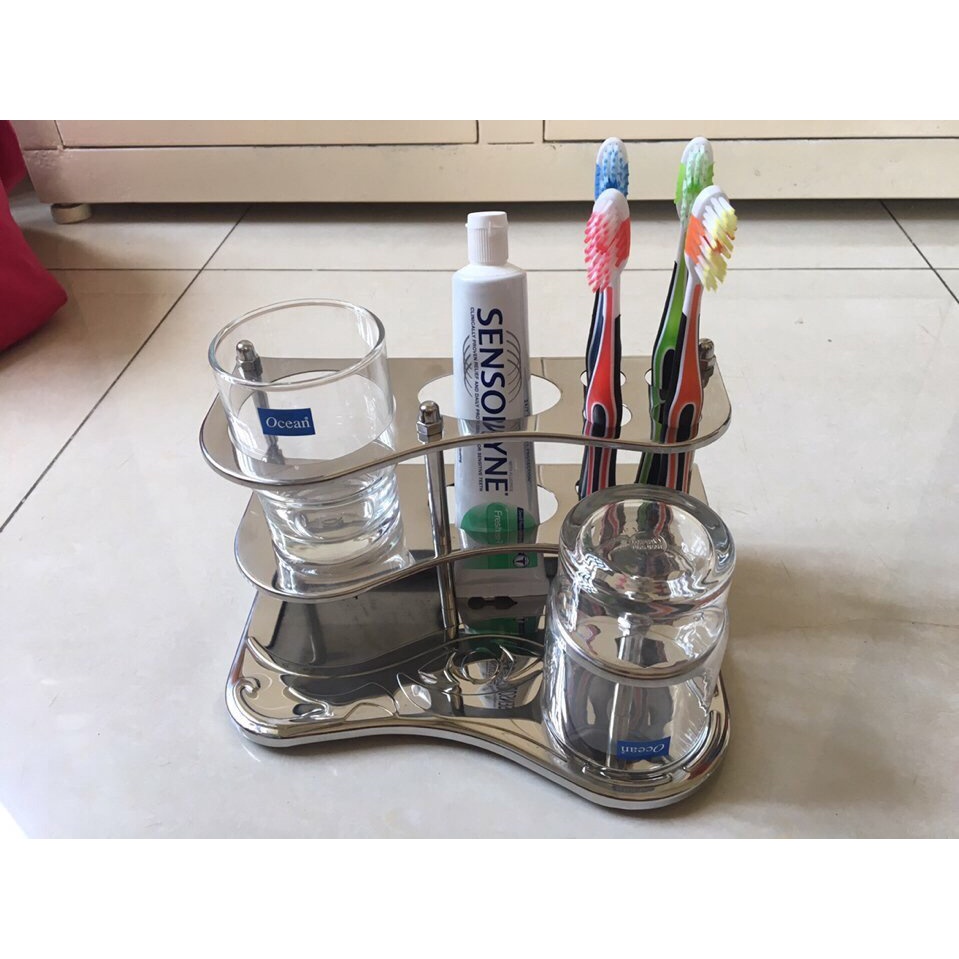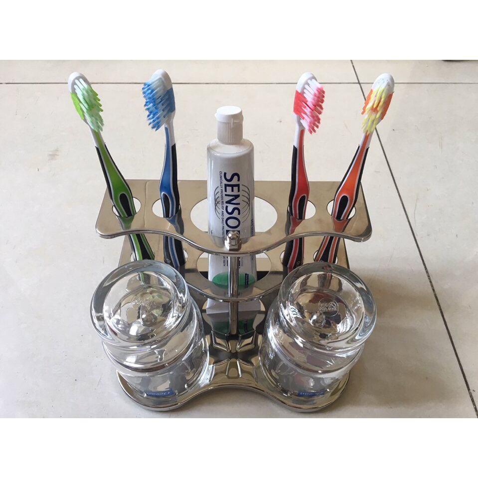 Kệ Để Ly, Bàn Chải, Kem Đánh Răng Inox 304 - Kệ Nhà Tắm Inox 304 Tặng Kèm Ly Thái Lan Cao Cấp