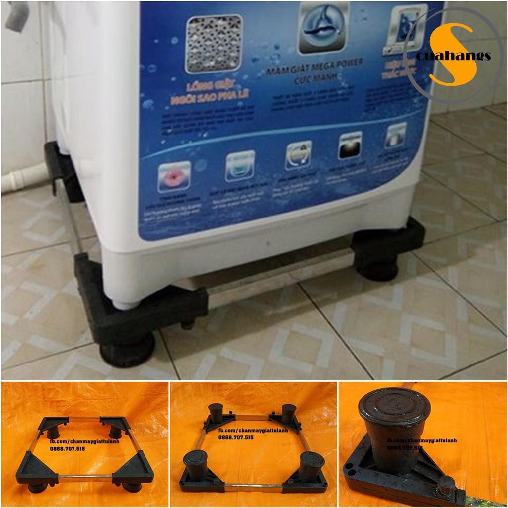 - 4 trụ đỡ lớn bằng nhựa đen, chân đế được lót bằng cao su tăng độ ma sát, điều chỉnh kích thước cho các loại máy theo ý muốn