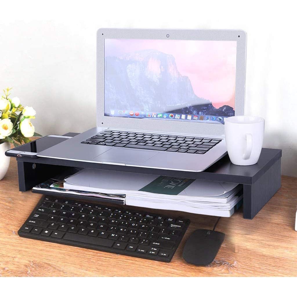 - Kệ gỗ màn hình, kệ để màn hình, giúp bạn ngồi đúng tư thế làm việc; nơi cất gọn bàn phím và chuột giúp mở rộng không gian trên bàn làm việc hiệu quả hơn.