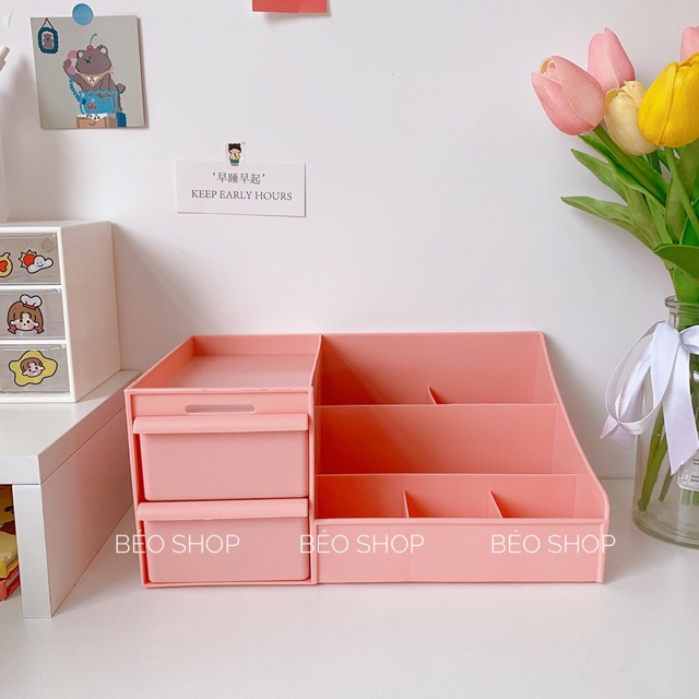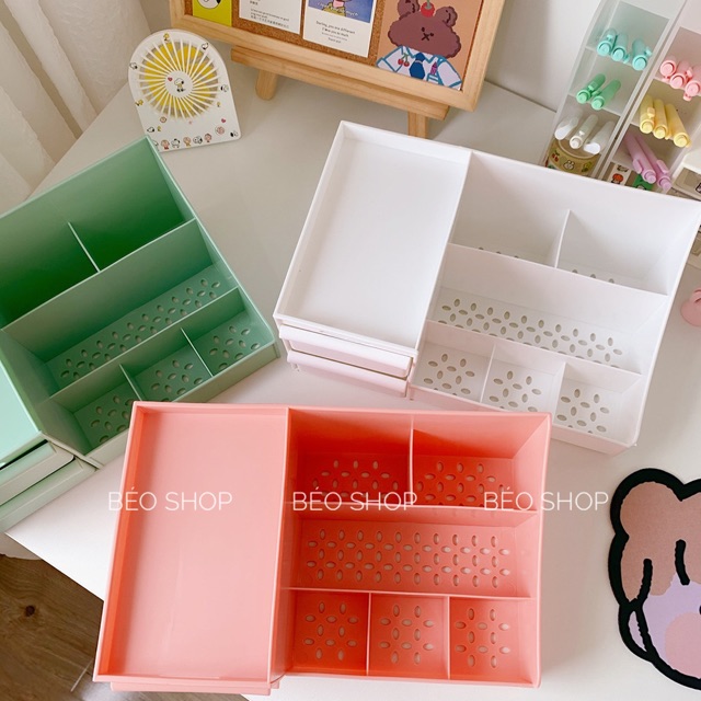 - Bên trong kệ đựng mỹ phẩm cực nhiều ngăn đặc biệt nhỏ gọn xinh xắn làm decor góc học tập thì quá tuyệt