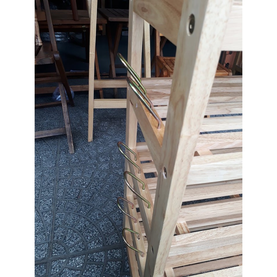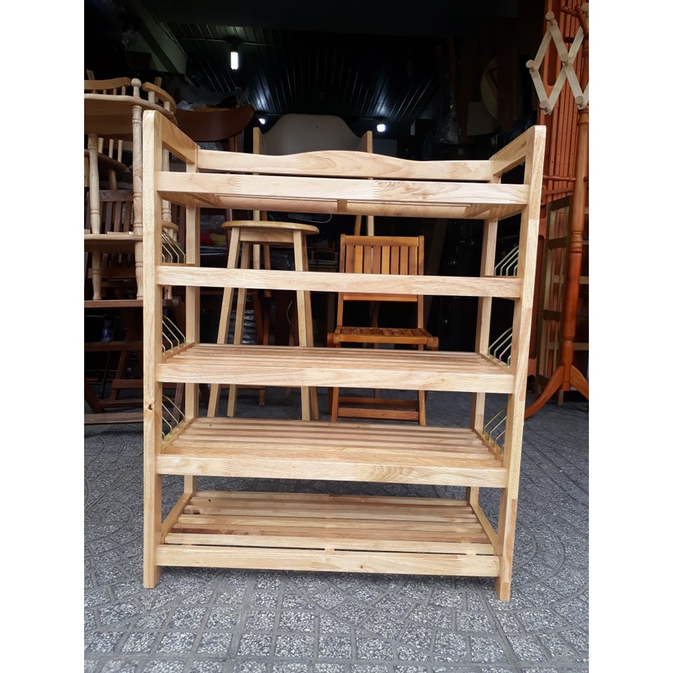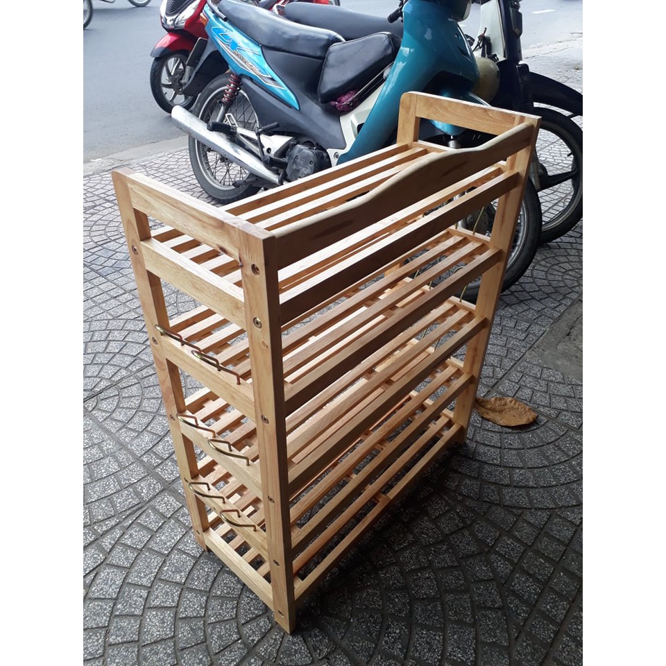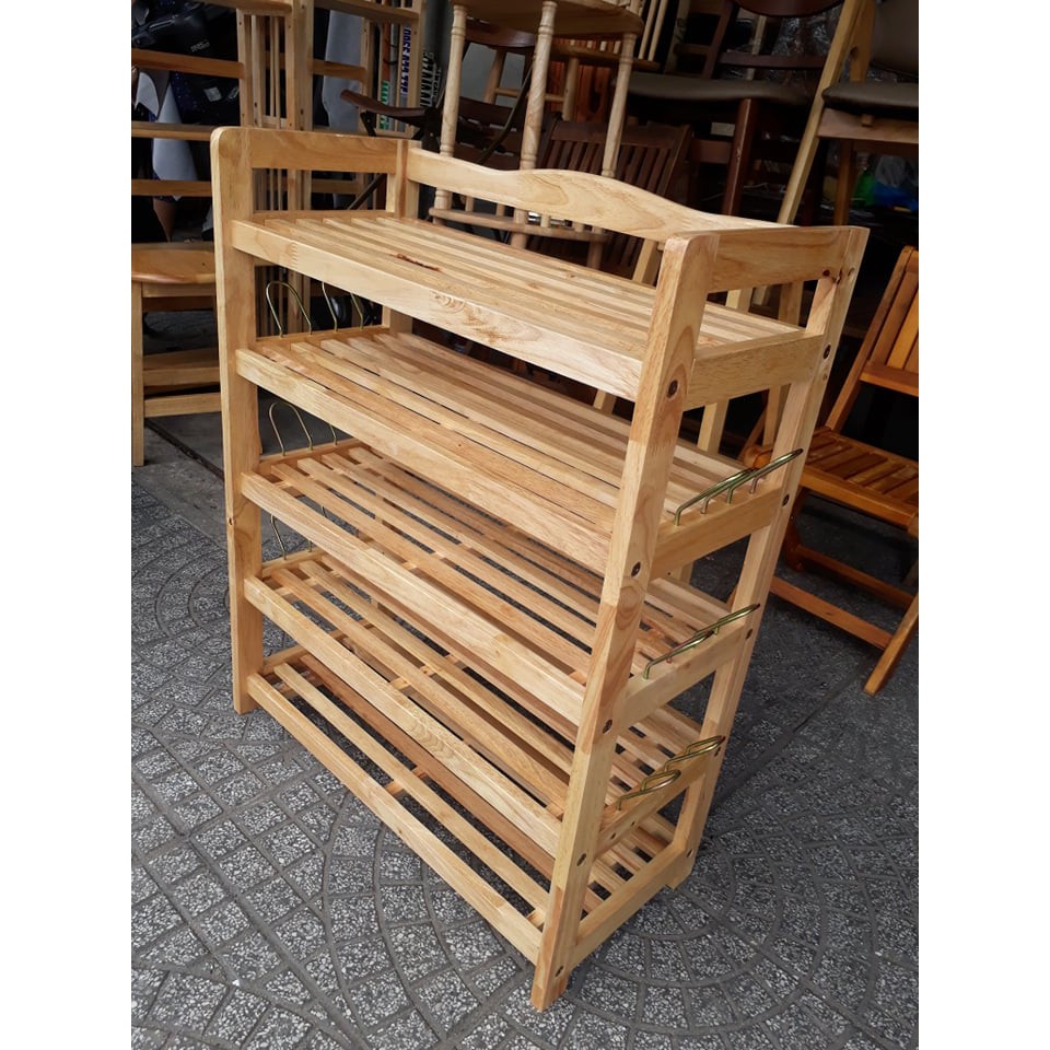 Kệ dép 5 tầng ngang 63cm, cao 79cm, sâu 28cm được làm bằng gỗ caosu , xử lý chống mối mọt. bảo đảm độ bền cho sản phẩm, không cong vênh, được làm bằng gỗ tự nhiên 100% nên quý khách có thể rửa bằng nước ko sợ thấm. Mỗi tầng Quý khách để được 3 đôi giày dép, 3 tầng giữa : mỗi tầng có thêm móc sắt để được thêm 2 đôi. Có 3 màu : màu gỗ tự nhiên (như hình), vàng cánh gián và nâu ( hình cuối cùng tượng trưng cho 3 màu)- Ngoài ra, chúng tôi chuyên cung cấp kệ sách. Kệ có từ 3 - 4 -5 tầng . Ngang từ 40 -50 -60 -80 - 90 - 100cm. Tùy theo nhu cầu và không gian nhà, Quý khách chọn số tầng và chiều ngang cho phù hợp. (3 - 4 - 5) x (40 - 50 - 60 - 80 - 90 - 100).