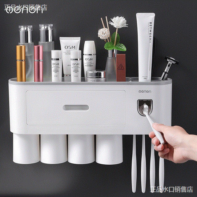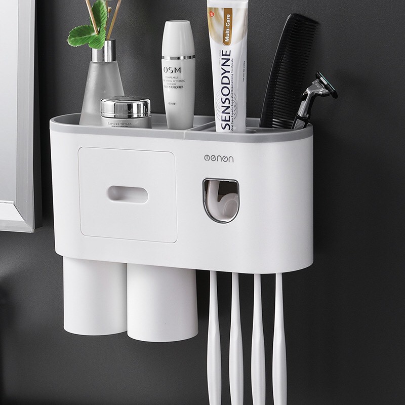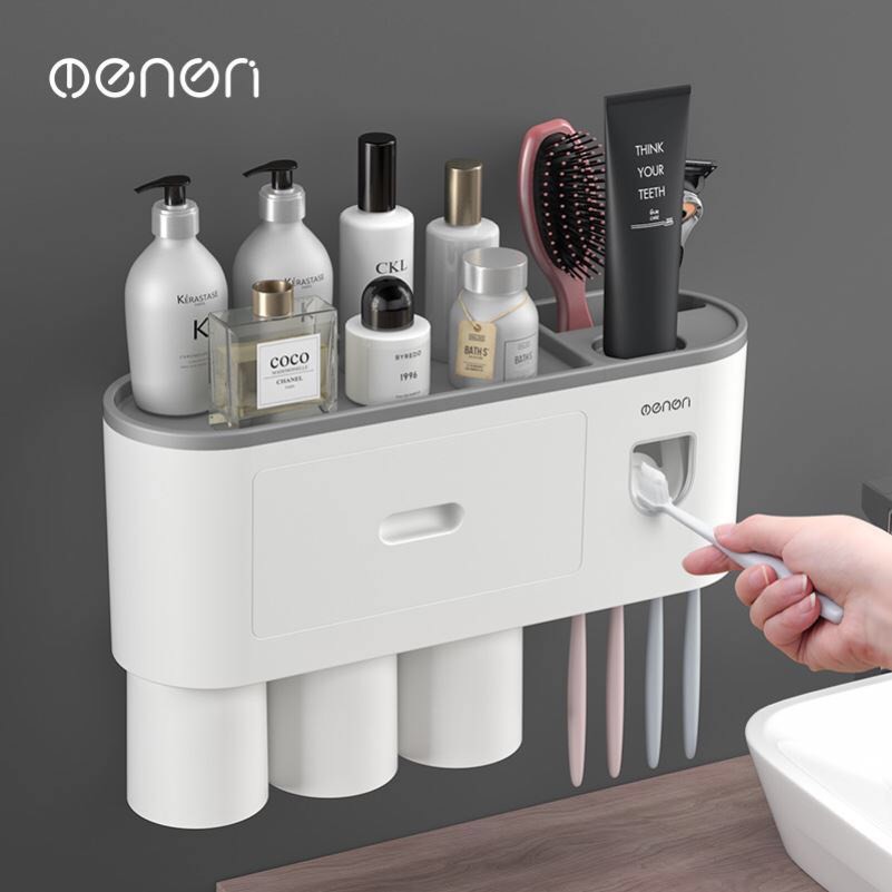 Kệ đựng đồ dùng trong phòng tắm đa năng, có 1 ngăn kéo rộng, dùng đựng mỹ phẩm, dầu gội, sữa tắm, kem đánh răng, dụng cụ vệ sinh...Kệ chịu được trọng lượng lên đến 6kg.Thiết kế gồm kệ để, ngăn kéo, cốc trúc ngược do lực hút từ tính giúp cốc luôn khô thoáng sạch nước, giá treo bàn chải riêng, giá để kem đánh răng thích hợp với mọi loại tuýp, chỉ việc đưa bàn chải vô giá và ấn nhẹ là kem đổ xuống.