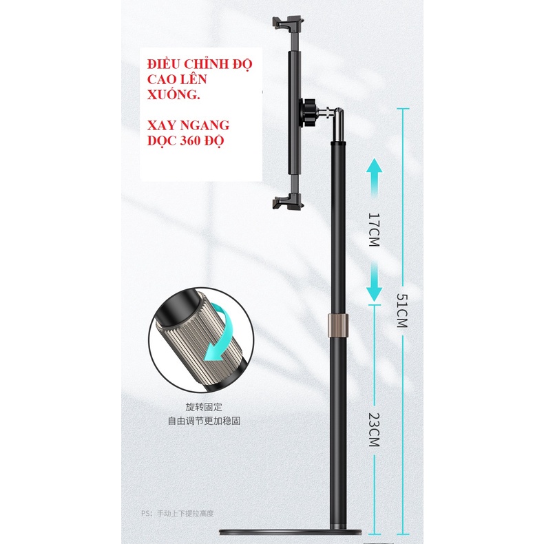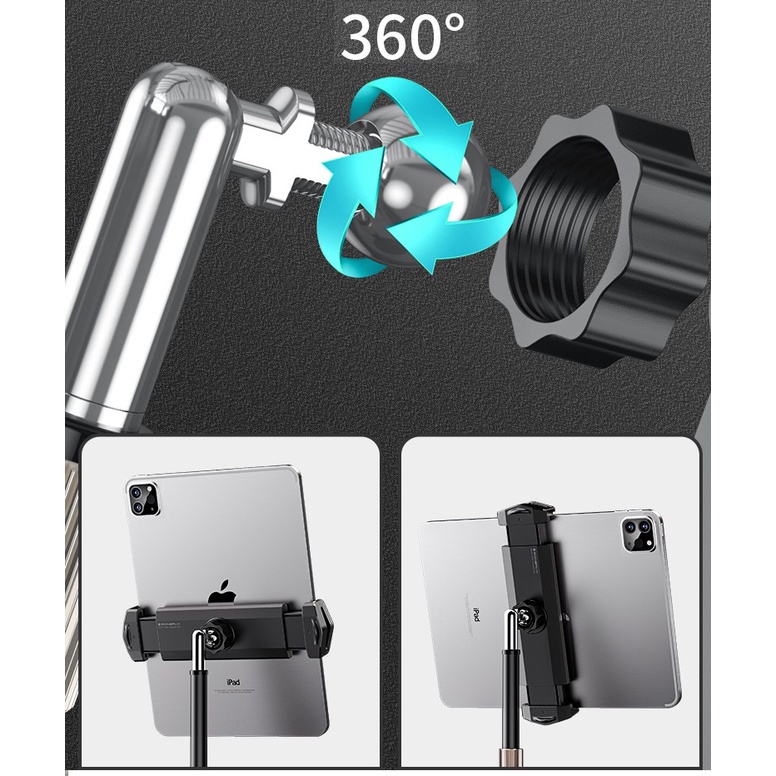 - Đầu kẹp rộng 24cm giá đỡ kẹp được tất cả các dòng điện thoại, ipad, máy tính bảng tới 13 icnh.