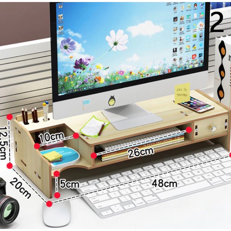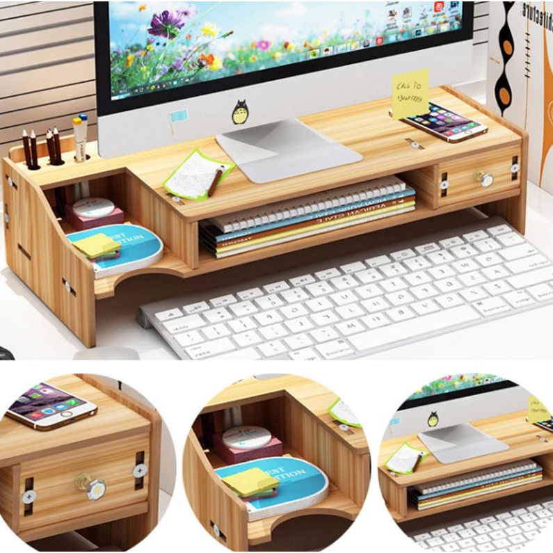 Kệ máy tính kệ sách kệ hồ sơ để bàn kèm cắm viết bằng gỗ KMT6Kệ máy tính kệ sách kệ hồ sơ để bàn kèm cắm viết bằng gỗ 2 mẫu MỚI Kiểu dáng hiện đại, thời trang, chất liệu tự nhiên, thiết kế tháo lắp thông minh, là món quà hấp dẫn cho người thân hay để trang trí cho bàn học/làm việc của gia đình! Dùng để máy vi tính, hồ sơ, sách vở, bút, đồ dùng văn phòng.., đặt trên bàn làm việc. Kệ được thiết kế thông minh nhằm làm giảm hiệu ứng đau lưng mỏi cổ cho dân văn phòng, sinh viên, học sinh.. khi phải làm việc với máy vi tính thường xuyên và liên tục . Chất liệu : Gỗ tự nhiên sấy khô Màu vân gỗ óc chó y hình Kích thước :KMT6(48x11.5x20.5). Xem kích thước cụ thể trên hình ảnh Trọng lượng : 2kg Tùy mẫu Gọn nhẹ dễ dàng tháo lắp mang theo. Lắp ráp theo hướng dẫn, có tua vít kèm sản phẩm. Đóng gói : Hộp Carton