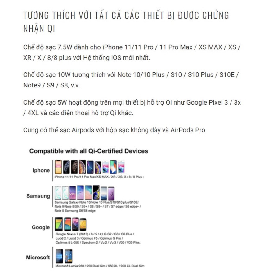 - Chế độ sạc 7.5W dành cho iPhone 11/11 Pro / 11 Pro Max / XS MAX / XS / XR / X / 8/8 plus với Hệ thống iOS mới nhất.