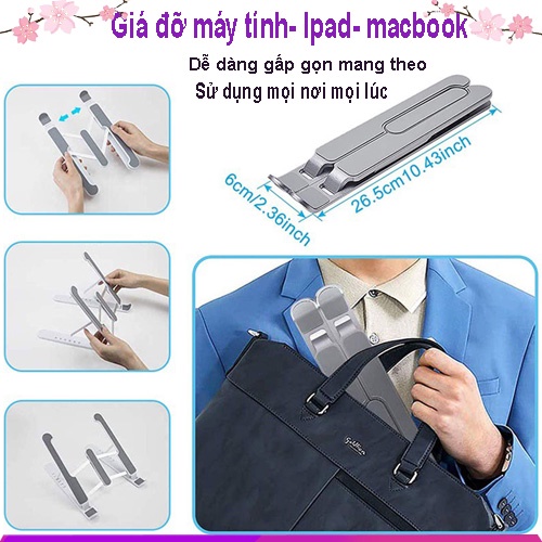 - Ngoài ra shop còn có giá đỡ laptop, macbook bằng nhựa ABS cao cấp, với 6 cấp độ nâng lên hạ xuống và có thể gập gọn mang theo hàng ngày rất tiện dụng, sau khi gấp gọn kịch thước chỉ ngang 1 chiếc quạt giấy, siêu nhẹ, siêu bền, mẫu mã rất đẹp